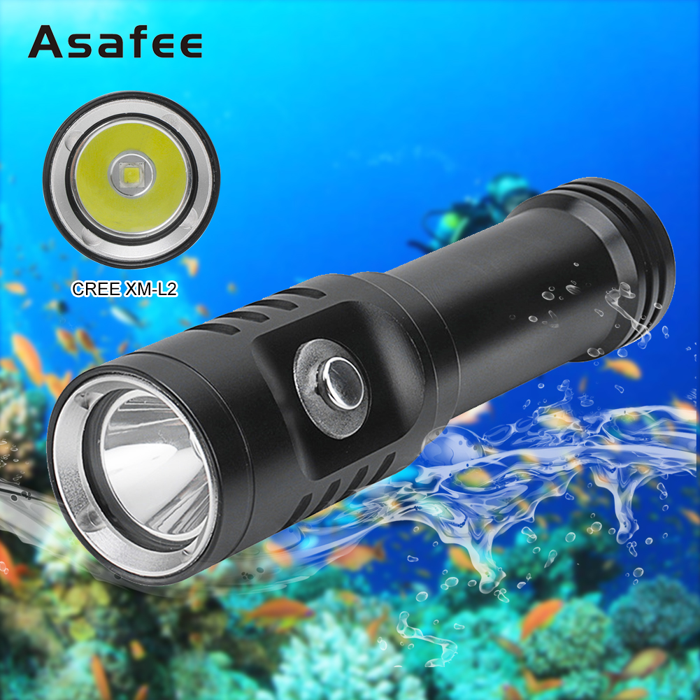 Diving Dive Light TorchBrand Name: AsafeeModel Number: AF01DBulb: XM-L2 LEDEmitting Color: whiteSwitch Mode: High>Low>SOSNet Weight: 110gDimensions: 130mm(length) x 27mm(diameter) x 30mm(head)The latest L2 LED provides greater light intensity and uniformity compared to conventional T5/T6 or U2 LED lamps!LED life: 100,000 hoursMade of high quality anodized aluminum alloy extremely scratch-proof and corrosion resistantCan accommodate up to 80 meters water depth divingIntegrated cool surface on the lamp head ensures low heat in spite of high performanceAdjustable light intensity under water operatedContinuously changing light intensity by slightly moving the switchSealed waterproof designDurable, double-lubricated O-ring seals provides double security to function under water3-optically tuned mirror reflector for optimal light outputPowered by 1 x 3.7V 18650 BatteryBest suited for: Diving, camping, hiking, trekking, hunting, fishing ...
