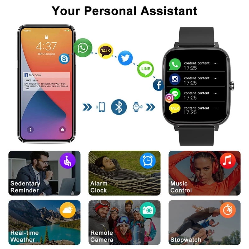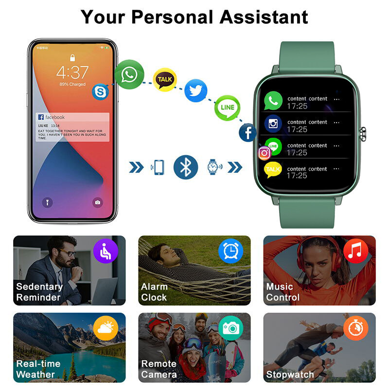 Answer/reject calls/make calls, heart rate monitoring, blood/blood oxygen pressure monitoring, sleep monitoring, sedentary reminder, port pedometer/calorie consumption/recording/exercise time, call reminder and display, message push and display, remote control Camera, HryFine Step, distance, find phone, language switch, wake-up function