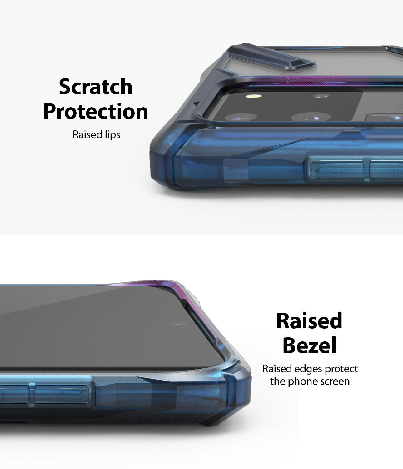 Durable thermoplastic urethane bumper protects all of the well-rounded sides and flawlessly fits all edges. The added addition of ridges in the TPU bumper adds a boosted grip control for comfortable handling. The raised front lip prevents your screen from touching a flat surface, and the rear camera also includes a tapered back lip to protect the lens.