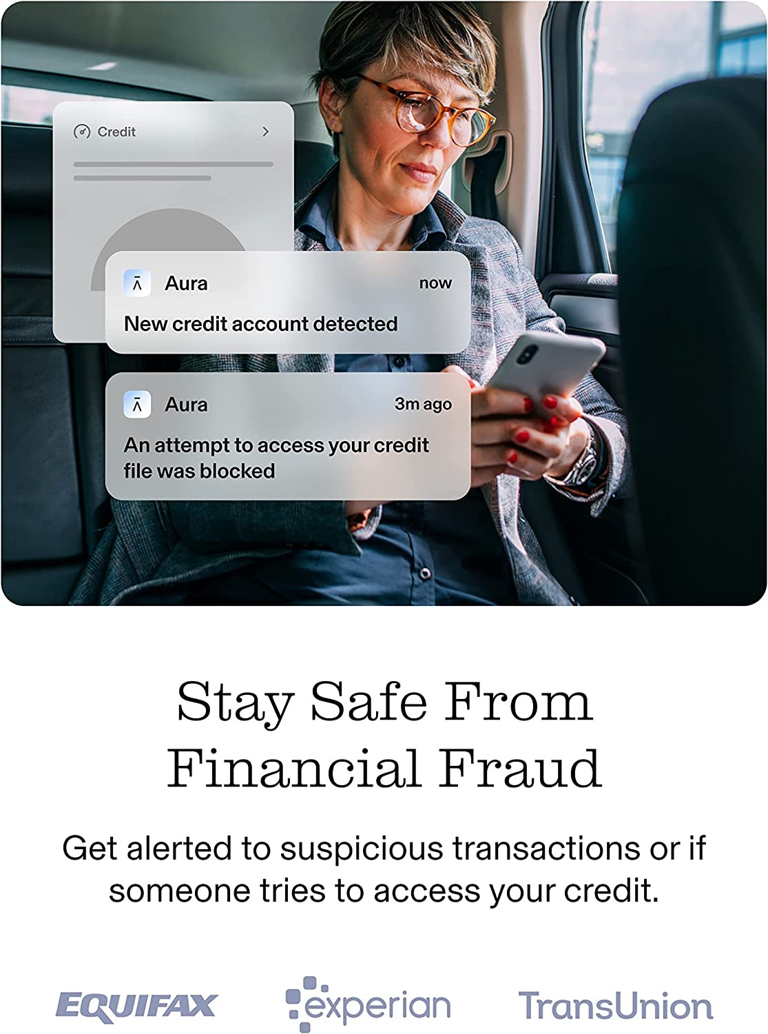 • STAY SAFE FROM FINANCIAL FRAUD: Aura’s credit monitoring helps you prevent financial loss by monitoring banks accounts and credit files, and notifying you of fraud up to 250x faster than the competitors.*