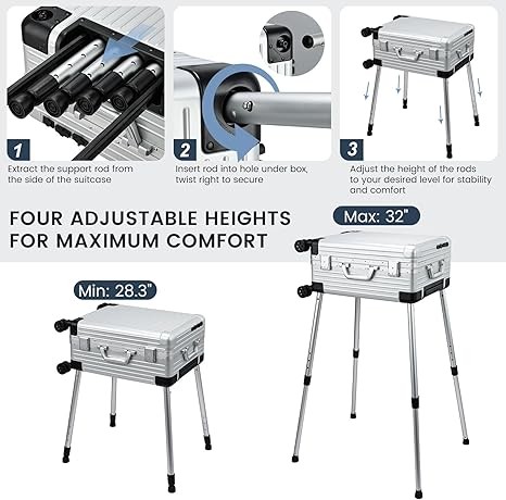 • 【FREE-STANDING WORKSTATION】- Durable telescopic legs can be positioned within the case and rotated to the right for immediate setup. By pressing and holding the metallic button while extending the legs, you can achieve four various heights from the ground to the base of the box, making it ideal for salon applications, showcasing in shopping malls, as well as for use by both home-based and freelance makeup artists, and for dance competitions. The bottom of the legs feature adjustable bowl-shaped feet to accommodate uneven floors.